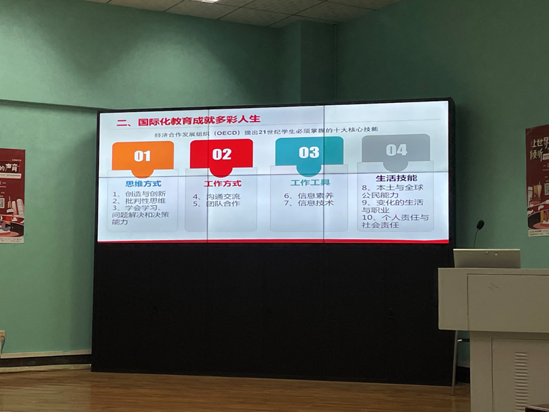 讲座临近尾声,张伶俐副经理与在座师生分享了自己聆听讲座的心得。在她看来,杨司长的讲座把握时代脉搏,高屋建瓴、主题突出、分析透彻,为未来的发展指明了方向。她借用上海外国语大学梅德明教授提出的“全球胜任力”表达对在场老员工的两点希冀:一、培养国际视野,不能仅限于学科知识的学习;二、志存高远,要有更长远的眼光和更广阔的格局。如果你瞄准月亮,即使迷失也是落在星辰之间。